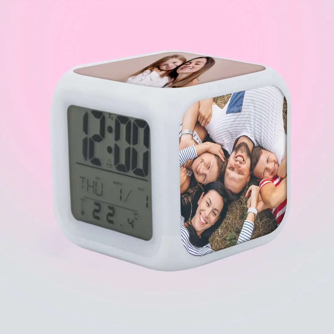 - Personalización: Puedes personalizar tres caras del reloj con sublimación o impresión en adhesivo especial. Cada cara tiene un tamaño de diseño de 6.5×6.5 cm, permitiéndote agregar tus imágenes, logotipos o diseños favoritos.